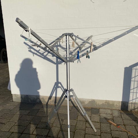 Sælges fordi jeg flytter tilbage til mit hjemland. 5 meter langt tørrestativ, helt nyt, stadig i tasken. Importeret fra Japan, meget høj kvalitet. Lavet af stærkt, holdbart nylonreb, vejrbestandigt. Leveres med kroge i begge ender. Nylonrebet er designet i et stigemønster for at låse bøjler på plads i stærk vind. Nem at rulle sammen efter brug eller bære. Fra et røgfrit og kæledyrsfrit hjem. Afhentningssted: Strandagervej, 2900 Hellerup