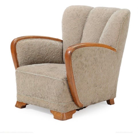 Sættet med to lænestole er fra midten af 1900-tallet, betrukket med kraftigt uldstof med beige bundfarve og nålestriber i grå.