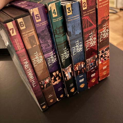 One Tree Hill sæson 4 og 5 dvd-bokse. Indeholder tv-serien One Tree Hill fordelt på to bokse, én for fjerde sæson og én for femte sæson. Hver boks rummer flere dvd-diske med afsnit fra den pågældende sæson samt ekstramateriale som angivet på bagsiden. Serien er tekstet og indtalt efter oplysningerne på omslagene og er egnet til aldersgruppen markeret med 11-års mærkning.