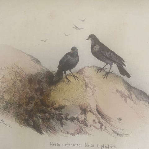 Håndkoloreret planche fra antik fransk bog med titlen "Musée du chasseur" (Jægerens Museum), der blev udgivet i Paris i 1838.