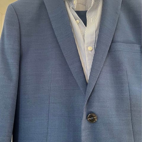 Hugo Boss jakkesæt i marineblå. Jakke i størrelse 44 og bukser i størrelse 50. Brugt 1 gang til egen konfirmation i 2025. Købt fra nyt til over 4000 kr.
