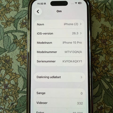 Apple iPhone 15 Pro med 256 GB intern hukommelse. Modellen har tredobbelt bagkamera, frontkamera i skærmen og flad kantet ramme. Enheden har USB‑C stik.
