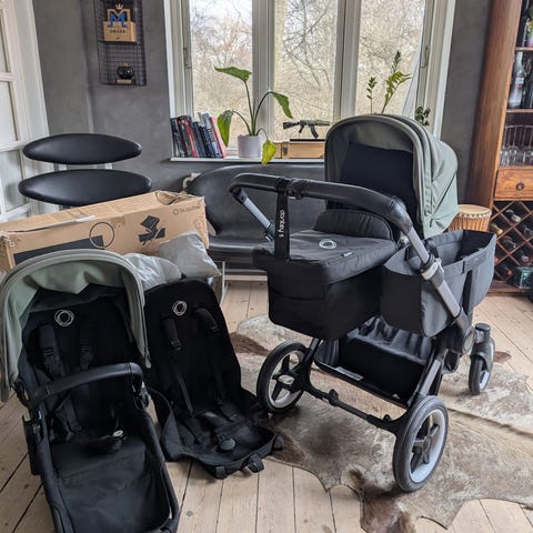 Købt brugt i 2023. Har både baby-liggestel og to sæder, 1 regnslag, samt sidevogn. Nye punkterfri dæk købt i 2024. Fastmonteret handsker medfølger. Har naturligvis synlige spor med 8 år på bagen, men virker fuldstændig upåklageligt og kører perfekt.