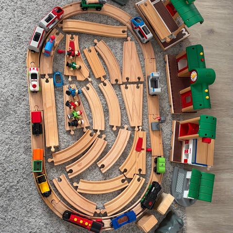 BRIO togbane med trætog og skinner. Sættet indeholder forskellige buede og lige træs kinner, brodele, hus/banegårdsbygning samt flere små tog og vogne i forskellige farver. Dele i træ og plast. Egnet som legetøj til børn, der kan bygge og udvide deres egen togbane.