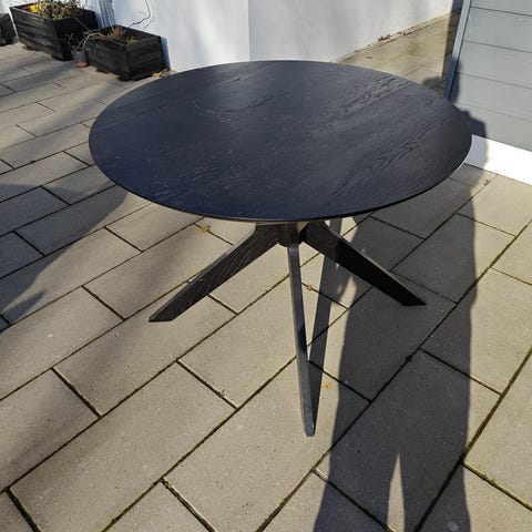 Skønt rundt spisebord/arbejdsbord med plads til 4-8 personer. Kan let skilles ad - består af to trekanter og to mellemlægsplader.