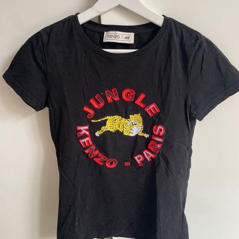 H&M Kenzo x H&M T-shirt til kvinder i sort bomuld i størrelse M. T-shirten har kort ærme og rund hals. På fronten er der et stort broderet motiv med teksten "Jungle Kenzo Paris" og en tiger. Materialet er 100 % bomuld ifølge vaskeanvisningen. Velegnet som hverdags-T-shirt eller dresset op til aften.