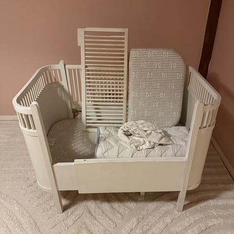 Klassisk tremmeseng med lameller i gavl og sider, egnet til spædbørn og småbørn. Som alle klassiske JUNO-senge er tremmesiderne lidt løse, og vi har løst det med en strip i hver side med et velourbånd bundet over. Kan trækkes ud og passe barnet i mange år. Malet træ. Smuk nostalgi med patina og charme.