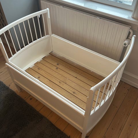 Den klassiske Lille Per-seng i hvid fra JUNO. (Ikke Stokke, men kan ikke få lov at fjerne det fra annoncen)
