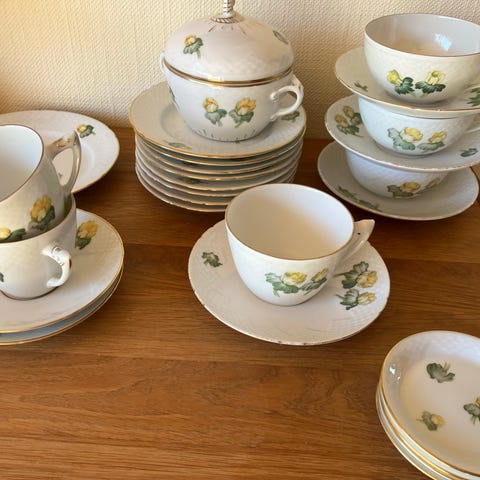 Sættet består af en kande samt kopper og talerkner med blomsterdesign.,Bemærk at mail, chat og beskeder ikke besvares, og varen skal købes på knappen "Gå til varen"