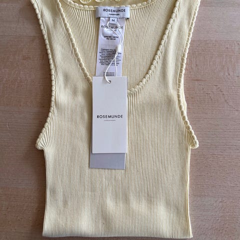 Rosemunde top med U-neck til dame i størrelse XS. Toppen forefindes i grøn, grå eller mørkeblå og fremstillet i silke. Modellen har brede stropper og blondekant langs udskæringen. Egnet som enkel overdel alene eller som lag under andre dele i garderoben.