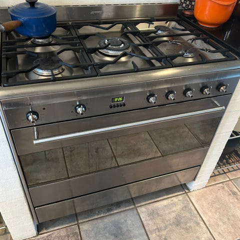 Fantastisk kvalitetskomfur fra Smeg med 5 gasblus og 90 cm ovn. Virker perfekt. Brugsspor ift slitage på ikonerne. Se billede. Inkl. riste og bageplader. Nypris ca 30.000