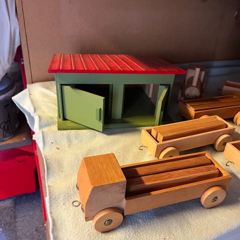 Legetøj, Stort Lokomotiv i træ, Stort damplokomotiv med tilhørende vogn.