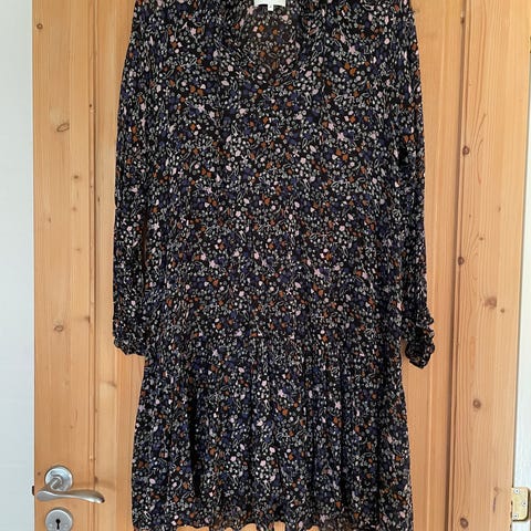 Second Female hverdagskjole i str. S. Kjolen er fremstillet i polyester og har et multifarvet blomstermønster med mørk bund og lyse blomster. Modellen har lange ærmer, rund hals og går cirka til midt på læggen. Velegnet som hverdagskjole til kvinder.