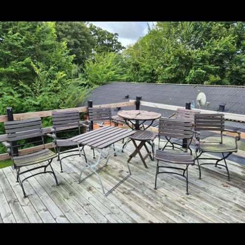Ok fin stand på træ I de 6 stole. Bord i samme stil. Et trip trap og et rundt. 1500 kr for alt samlet