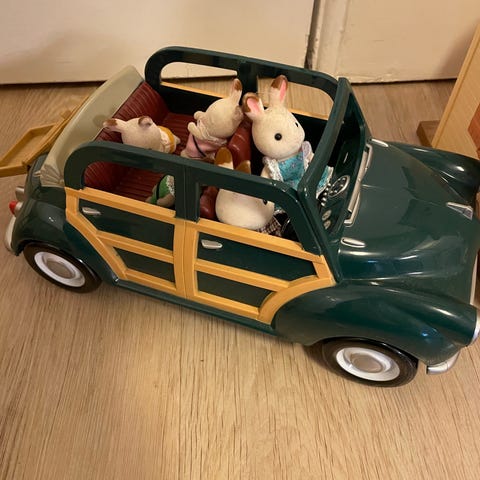 Sylvanian Families legetøjsbil i grøn plast med hvide detaljer og tagbagagebærer. Bilen har brune sæder indvendigt og plads til flere figurer. Egnet som tilbehør til Sylvanian Families figurer og huse og kan indgå i forskellige lege- og rollespilsscenarier.
