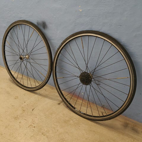Ca 30 mm høje. 700c. Shimano hub. Brugte dæk og skiver (140mm) medfølger.