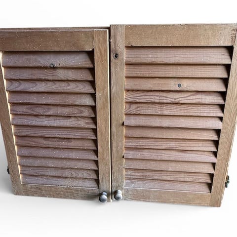Jalousiskab i grå laminat med 6 justerbare åbne hylder.