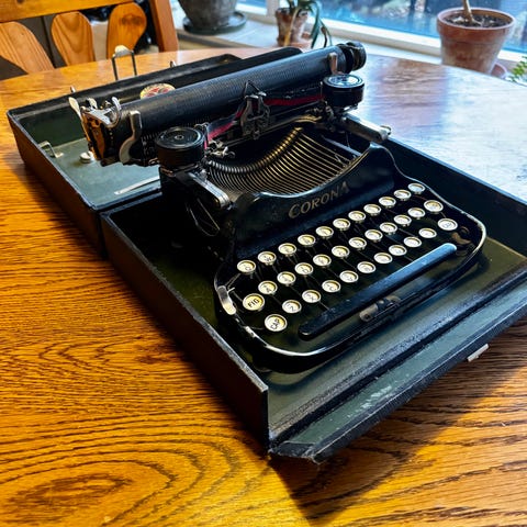 Corona skrivemaskine i sort metal. Klassisk mekanisk model med rundede taster og bærerulle i toppen. Egnet som funktionsdygtigt skriveværktøj, reservedele eller som dekorativt indretningsobjekt. Maskinen har manuelt tastatur og papirholder samt metalhus med synlige mekaniske dele.