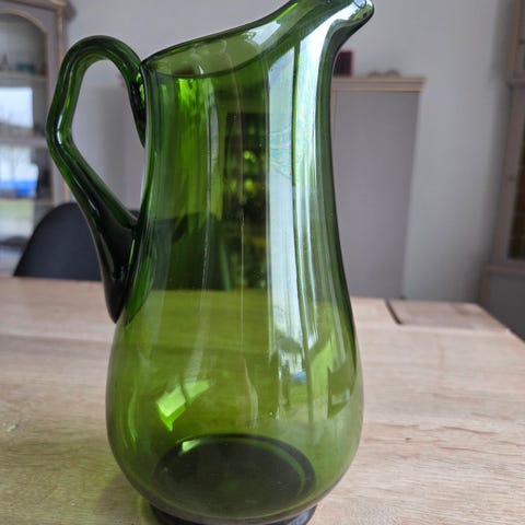 Røgfarvet glas kande . Kanden er fremstillet i gennemfarvet glas med hank og hældetud i samme materiale. Formen er konisk med rund fod og bred åbning foroven. Velegnet som lille kande, olielande karaffel eller dekorativ glasgenstand i køkken eller stue.