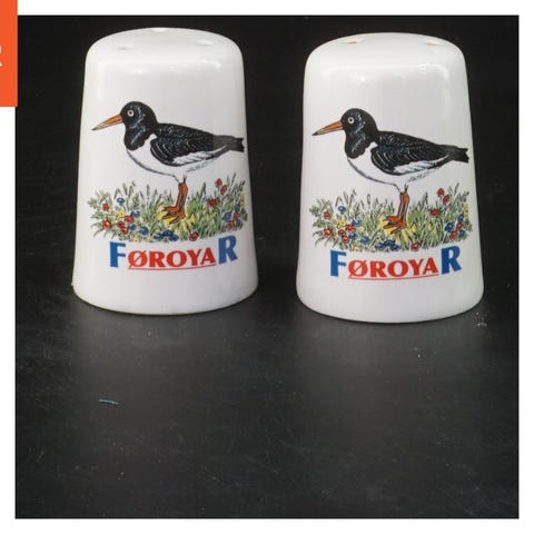 Føroyar olielampe i hvidt porcelæn med trykt væddermotiv på siden og teksten "Føroyar" på en anden side.