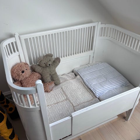 Flot børneseng inkl. økologisk kvalitetsmadras og 2 økologiske lagner. Klar til brug.