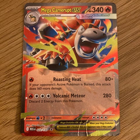 Pokémon Mega Camerupt EX samlekort. Motiv af Mega Camerupt med angrebene Roasting Heat og Volcanic Heat. Kortet er en EX-version med 340 HP, trykt på standard Pokémon TCG karton og leveres i plastlomme som vist på billederne. Egnet til samling eller spil i Pokémon Trading Card Game.