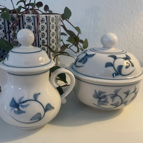 Royal Copenhagen Noblesse. Stellet består af 7 kagetallerkener 17cm, 4 underkopper, 4 kopper, lille flødekande , sukkerskål med låg, samt 3 asietter alle i hvid porcelæn med blå blomstermotiv. Egnet som kaffestel eller mindre serveringsstel til borddækning i hjemmet. Alt er 1. Sortering og helt intakt