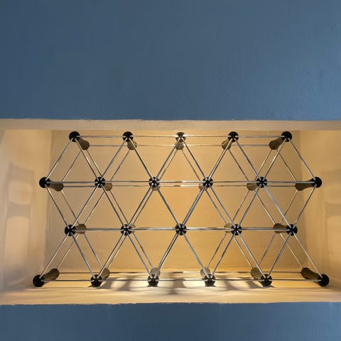 Konstruktionen er i hvidt plademateriale og er beregnet til montering på væg, f.eks. over en bordplade eller i et køkken- eller alrum. Velegnet til organiseret opbevaring af vinflasker eller andre flasker og glas i hjemmet.