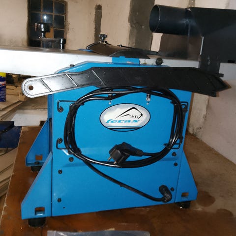 Støbejerns maskine. Ca. 20 cm knivbredde. Ikke afprøvet. Motoren er formentlig en jævnstrømsmotor. Standen er ellers pæn. Arvestykke fra møbelsnedker. Kvittering haves fra 1940-erne. Dansk kvalitet. Ca. 100 kg.