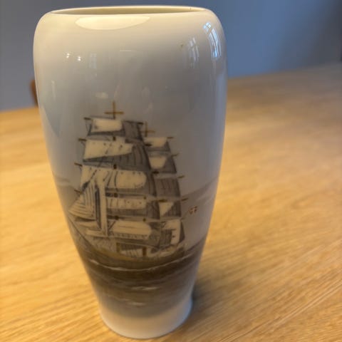 Vase, Vase med sejlbåd, Lyngby Porcelæn, Smuk vase med sejlbåd på Øresund fra Lyngby Porcelæn med nr. P 128 - 2 - 56 sælges. Den er 18 cm høj og har en diameter på 8 / 11 cm. Kan sende med DAO og GLS.