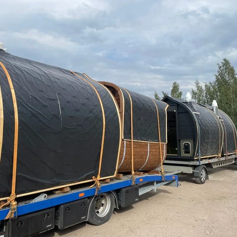 Saunaen leveres færdigbygget. Kunden står selv for aflæsning fra fragtbil.