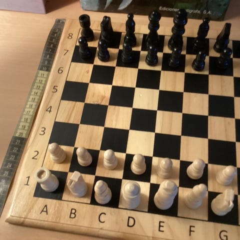 Skakspil med skakbræt og komplette brikker. Brættet er udført i lyst træ med sorte og hvide felter samt bogstav- og talangivelser langs kanterne. Brættet fremstår som et sammenklappeligt eller todelt bræt, der kan lægges sammen på midten. Skakbrikkerne er klassiske i design i lys og mørk farve, formet i træ eller træ-lignende materiale. Egnet til almindeligt skakspil i hjemmet eller til fritidsbrug.