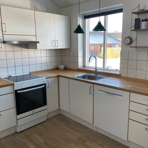 Fuld køkken med skabe, låger, bordplade, vask, og mulighed for at købe hvidevare med.