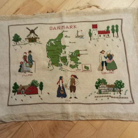 Broderi med motiv af Danmark som landkort. Kortet viser de danske landsdele med markerede veje og kyster, omgivet af en bort med små broderede motiver som bygninger, landskaber, vindmølle, skib og andre danske kendetegn. Broderiet er udført på lys stof med flerfarvede broderigarn og er egnet som vægophæng eller dekoration i hjemmet.