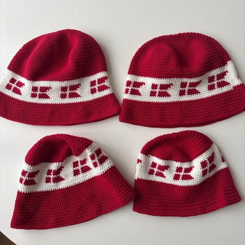 Hæklet jule bøllehat i rød og hvid efter egen opskrift og design.