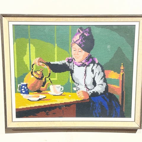 🖼️ Billede broderet stramaj korssting med ramme. Ældre, håndbroderet billede, sandsynligvis fra 1950'erne eller 1960'erne, der skildrer et hyggeligt motiv. Billedet er udført med korssting / stramajbroderi, monteret i en klassisk træramme med glas. Kunsthåndværk som har været almindelig i danske hjem, men som nu er blevet vintage. Måske kan du bruge selve broderiet til noget kreativt, en taske, en jakke, vest, pude, eller andet krea-projekt.