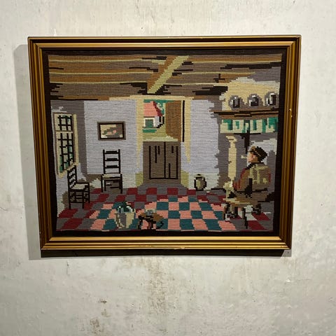 🖼️ Billede broderet stramaj korssting med ramme. Ældre, håndbroderet billede, sandsynligvis fra 1950'erne eller 1960'erne, der skildrer et hyggeligt motiv. Billedet er udført med korssting / stramajbroderi, monteret i en klassisk træramme med glas. Kunsthåndværk som har været almindelig i danske hjem, men som nu er blevet vintage. Måske kan du bruge selve broderiet til noget kreativt, en taske, en jakke, vest, pude, eller andet krea-projekt.