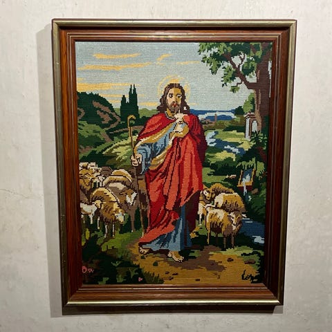 🖼️ Billede broderet stramaj korssting med ramme. Ældre, håndbroderet billede, sandsynligvis fra 1950'erne eller 1960'erne, der skildrer et hyggeligt motiv. Billedet er udført med korssting / stramajbroderi, monteret i en klassisk træramme med glas. Kunsthåndværk som har været almindelig i danske hjem, men som nu er blevet vintage. Måske kan du bruge selve broderiet til noget kreativt, en taske, en jakke, vest, pude, eller andet krea-projekt.