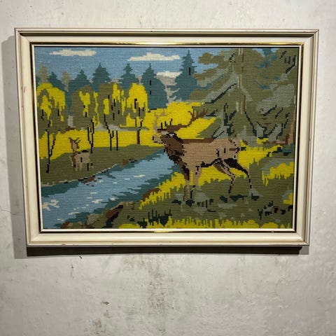 🖼️ Billede broderet stramaj korssting med ramme. Ældre, håndbroderet billede, sandsynligvis fra 1950'erne eller 1960'erne, der skildrer et hyggeligt motiv. Billedet er udført med korssting / stramajbroderi, monteret i en klassisk træramme med glas. Kunsthåndværk som har været almindelig i danske hjem, men som nu er blevet vintage. Måske kan du bruge selve broderiet til noget kreativt, en taske, en jakke, vest, pude, eller andet krea-projekt.