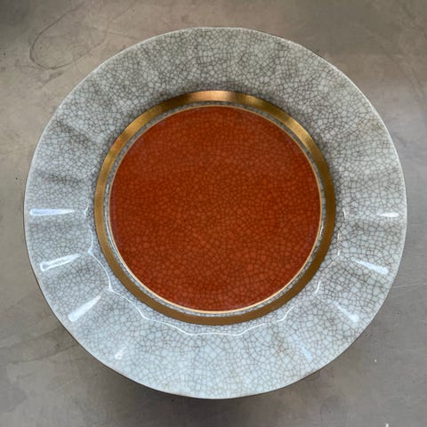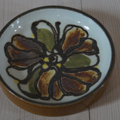 Skålen er rund med glat overflade og dekoreret med brune motiver, der viser fisk.