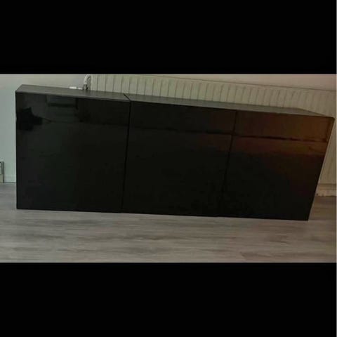 Fin reol i sort med hylder i lys finer. 3 sektioner, som kan stå samlet eller hver for sig. Skuffe med rum i den ene sektion, lidt skader i finer i ene rum, se foto.