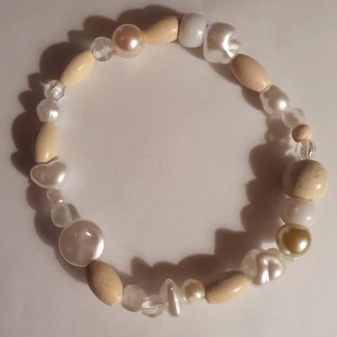 Sødt armbånd med store perler på elastiksnor. I glas og plastik perler. Farverne hvid og sølv. Kun de hvide perler vejer lidt, så det er ikke tungt tros perlerne størrelser. Aldrig brugt. Håndlavet.
