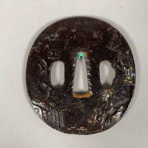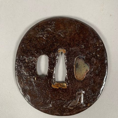 Originalt japansk fuchi-gashira fra Edo-perioden, rød kobberbase med guldbelag og mønster af bølger og chidori-fugle; kant 2,4 cm x 3,9 cm x 1 cm og hoved 1,7 cm x 3,5 cm x 0,6 cm, samlet vægt 28 g, i god stand. Klik på den blå "gå til varen" knap, for at købe eller byde på denne vare. Den samlede pris vil blive vist inden du afgiver dit bud.