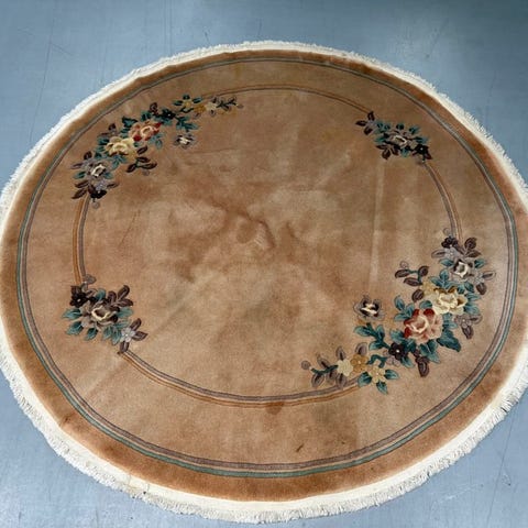 Vi præsenterer et elegant par kinesiske tæpper fra Beijing, oprindeligt vævet som sengetæpper. Det skiller sig ud ved sit raffinerede traditionelle kinesiske blomsterdesign med stiliserede peoner og geometriske kantbånd over bløde nuancer af elfenben, fersken og jadeblå.