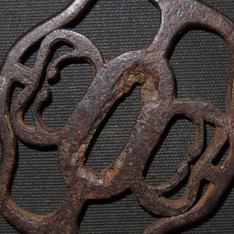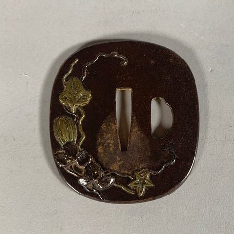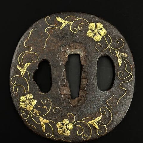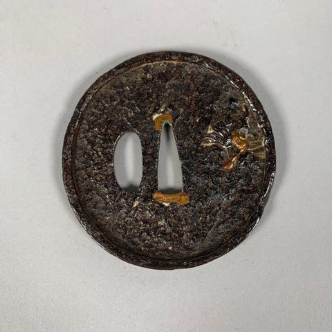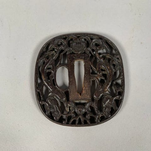 Sukashi tsuba C5-320, Edo-perioden, smedet jern med guldrinlæg og åbent arbejde, 7,7 × 7,7 cm, dybde 0,3 cm, vægt 90 g, oprindelse Japan, ægte/original, i rimelig stand. Klik på den blå "gå til varen" knap, for at købe eller byde på denne vare. Den samlede pris vil blive vist inden du afgiver dit bud.