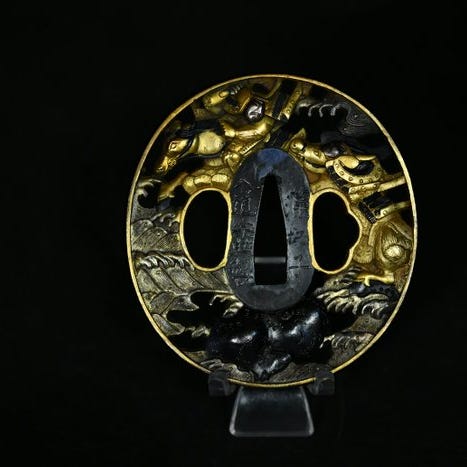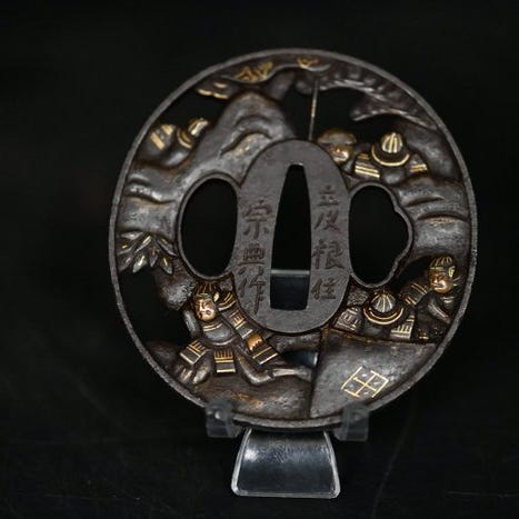 Masterwork tsuba fra Edo-perioden i Japan, jernstykke med kobber-, sølv- og guldindlæg, 8,7 × 8,2 cm, underskrevet af Aizu jyu Matsumura Minamoto Shichiro Takamura, med NBTHK Hozon-certifikat og trææske, provenance fra et galleri/antikforretning, i fremragende stand. Klik på den blå "gå til varen" knap, for at købe eller byde på denne vare. Den samlede pris vil blive vist inden du afgiver dit bud.