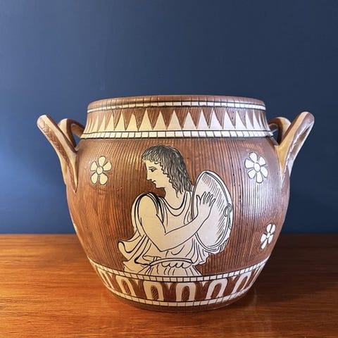 Stor håndmalet maiolika-keramikvase, underskrevet “F. Russo”, fremstillet i Vietri, Italien, fra 1980 til 1990, i meget god stand med mindre tegn på slid og alder, med en slank form, elegant skulpturel hals og formet hældetud, dekoreret i blå, gul, grøn, rosa og okker. Klik på den blå "gå til varen" knap, for at købe eller byde på denne vare. Den samlede pris vil blive vist inden du afgiver dit bud.