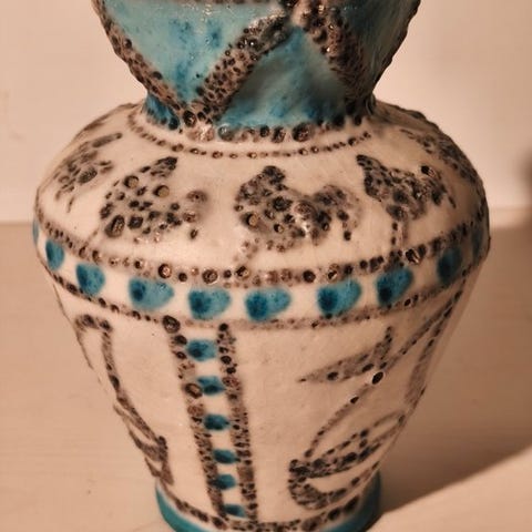 Opera med stærk scenografisk virkning, kendetegnet ved en slank form med et elegant skulpturelt halsstykke og en formet hældekant. Dekorationen, udført med markante sorte streger og livlige farver (blå, gule, grønne, lyserøde og oker), viser figurative og naturalistiske motiver i en ekspressiv og moderne stil, typisk for den italienske kunstproduktion i anden halvdel af det tyvende århundrede.