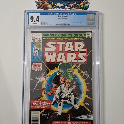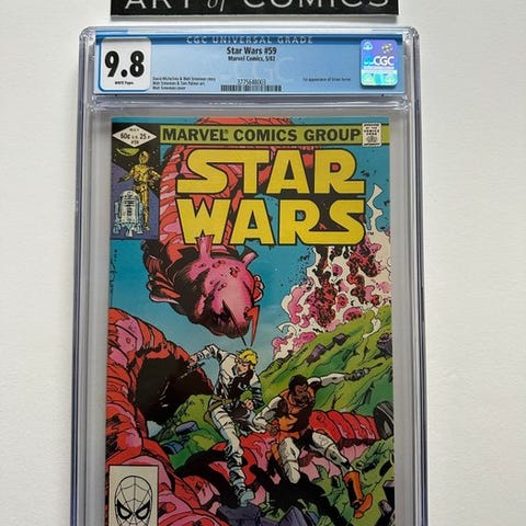 Star Wars, første udgave, CGC 9.6 Newsstand Edition vurderet tegneserie med Jaxxon, Hedji, Don-Wan, Amaiza og Jimm, kunstnere Howard Chaykin, Tom Palmer, Rick Hoberg, Tony DeZuniga og Don Glut, i mint tilstand. Klik på den blå "gå til varen" knap, for at købe eller byde på denne vare. Den samlede pris vil blive vist inden du afgiver dit bud.
