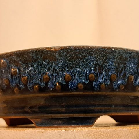 Til salg: en ny og ubrugt bonsai-skål med en særlig karakter. Denne skål skiller sig straks ud med sin elegante form, med en længde på 21,5 cm, bredde 17 cm og en højde på 5,5 cm – ideel til små til mellemstore bonsaier eller som stilfuld accentpot i dit hjem.